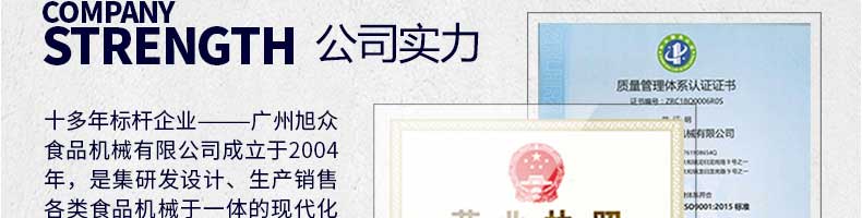 廣州旭眾食品機械有限公司是一家集科研開發(fā),生產(chǎn)設計,營銷服務為一體的現(xiàn)代化生產(chǎn)企業(yè)。現(xiàn)代化生產(chǎn)車間,精湛制造技術,所產(chǎn)機械歷經(jīng)市場重重考驗,不斷贏得海內外客戶的贊譽。