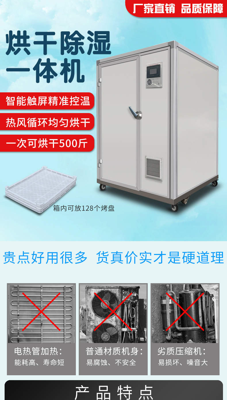 烘干除濕一體機,烘干除濕體機,智能觸屏精準控溫熱風循環(huán)均勻烘干次可烘干500斤,智能烘干時代出類拔萃的新體驗,1度電能=4度,熱能比傳統(tǒng)電加熱。干燥設備減少60%以上電能消耗。