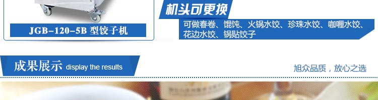 JGB-120-5B型餃子機,本機是一款可生產(chǎn)各種肉餡、肉菜混合餡、全菜餡及其他種餡餃子的設(shè)備。一機多用途,只要更換模具,就可制作不同的食品,如春卷、餛飩、咖喱角、鍋貼等。適用于賓館、飯店、餐廳、團體食堂加工,幼兒園、速凍餃子生產(chǎn)。
