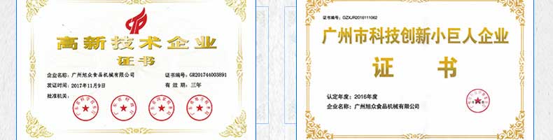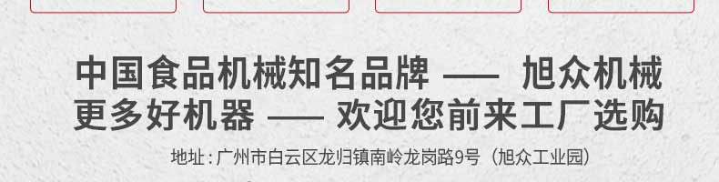 廣州旭眾食品機(jī)械有限公司是一家集科研開發(fā),生產(chǎn)設(shè)計(jì),營銷服務(wù)為一體的現(xiàn)代化生產(chǎn)企業(yè)?,F(xiàn)代化生產(chǎn)車間,精湛制造技術(shù),所產(chǎn)機(jī)械歷經(jīng)市場(chǎng)重重考驗(yàn),不斷贏得海內(nèi)外客戶的贊譽(yù)。