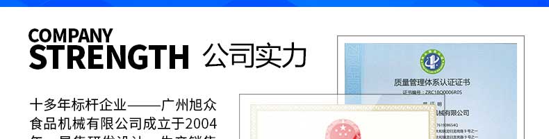 廣州旭眾食品機(jī)械有限公司是一家集科研開(kāi)發(fā),生產(chǎn)設(shè)計(jì),營(yíng)銷服務(wù)為一體的現(xiàn)代化生產(chǎn)企業(yè)?,F(xiàn)代化生產(chǎn)車間,精湛制造技術(shù),所產(chǎn)機(jī)械歷經(jīng)市場(chǎng)重重考驗(yàn),不斷贏得海內(nèi)外客戶的贊譽(yù)。