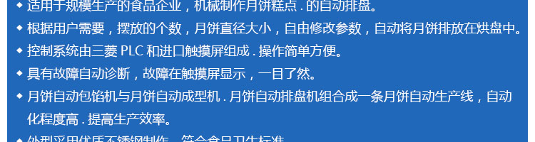 SZ-08型月餅自動(dòng)排盤機(jī),可同于制作各種月餅。適用于蛋糕房、休閑食品廠、食品加工產(chǎn)、面包房、月餅加工廠、超市、學(xué)校、食堂等各種工作場所??蓾M足不同客戶群體。免費(fèi)提供工藝技術(shù)。