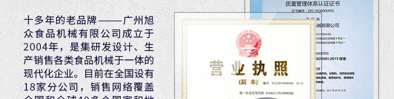 廣州旭眾食品機械有限公司是一家集科研開發(fā),生產(chǎn)設(shè)計,營銷服務(wù)為一體的現(xiàn)代化生產(chǎn)企業(yè)?,F(xiàn)代化生產(chǎn)車間,精湛制造技術(shù),所產(chǎn)機械歷經(jīng)市場重重考驗,不斷贏得海內(nèi)外客戶的贊譽。