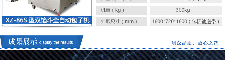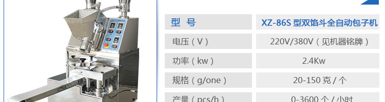 XZ-86S型雙餡斗全自動包子機(jī),可生產(chǎn)各種肉包、肉菜包、菜包、小籠包、湯包、水晶包、圓饅頭、奶黃包、豆沙包、叉燒包、南瓜餅等幾十種包餡制品。適用于賓館、飯店、學(xué)校、機(jī)關(guān)企業(yè)食堂、饅頭或包子加工廠、早餐工程店及速凍食品廠等單位??蓾M足不同客戶群體。免費(fèi)提供工藝技術(shù)。免費(fèi)上門培訓(xùn)指導(dǎo)安裝。