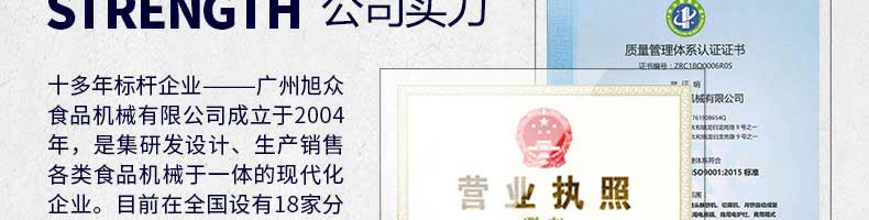 廣州旭眾食品機械有限公司是一家集科研開發(fā),生產(chǎn)設計,營銷服務為一體的現(xiàn)代化生產(chǎn)企業(yè)。現(xiàn)代化生產(chǎn)車間,精湛制造技術(shù),所產(chǎn)機械歷經(jīng)市場重重考驗,不斷贏得海內(nèi)外客戶的贊譽。