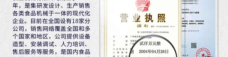廣州旭眾食品機械有限公司是一家集科研開發(fā),生產(chǎn)設計,營銷服務為一體的現(xiàn)代化生產(chǎn)企業(yè)?,F(xiàn)代化生產(chǎn)車間,精湛制造技術,所產(chǎn)機械歷經(jīng)市場重重考驗,不斷贏得海內外客戶的贊譽。