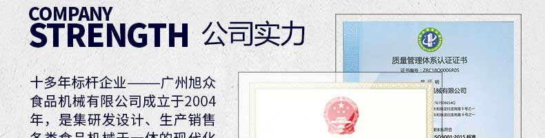 廣州旭眾食品機(jī)械有限公司是一家集科研開發(fā),生產(chǎn)設(shè)計,營銷服務(wù)為一體的現(xiàn)代化生產(chǎn)企業(yè)?,F(xiàn)代化生產(chǎn)車間,精湛制造技術(shù),所產(chǎn)機(jī)械歷經(jīng)市場重重考驗,不斷贏得海內(nèi)外客戶的贊譽(yù)。