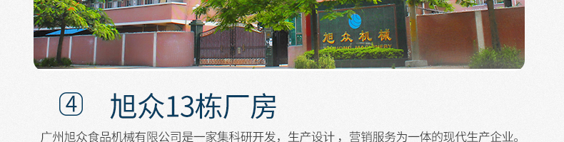 廣州旭眾食品機(jī)械有限公司是一家集科研開(kāi)發(fā),生產(chǎn)設(shè)計(jì),營(yíng)銷服務(wù)為一體的現(xiàn)代化生產(chǎn)企業(yè)?,F(xiàn)代化生產(chǎn)車間,精湛制造技術(shù),所產(chǎn)機(jī)械歷經(jīng)市場(chǎng)重重考驗(yàn),不斷贏得海內(nèi)外客戶的贊譽(yù)。