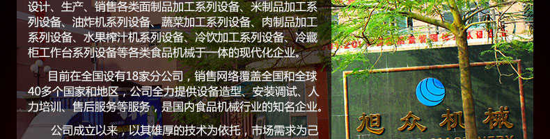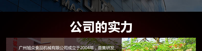 廣州旭眾食品機械有限公司是一家集科研開發(fā),生產設計,營銷服務為一體的現(xiàn)代化生產企業(yè)?,F(xiàn)代化生產車間,精湛制造技術,所產機械歷經市場重重考驗,不斷贏得海內外客戶的贊譽。