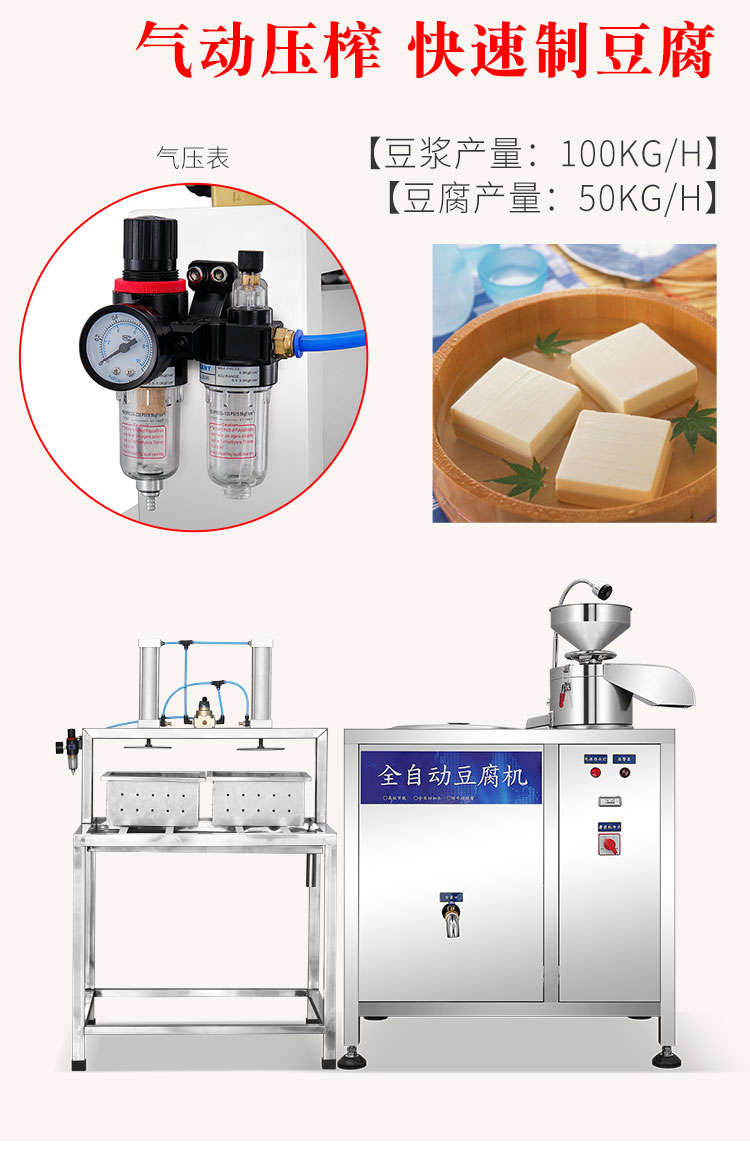 XZ-100型全自動(dòng)豆腐機(jī),商用全自動(dòng)氣動(dòng)壓榨豆腐機(jī)氣動(dòng)壓榨,分離漿水,不傷豆腐,定型美觀。