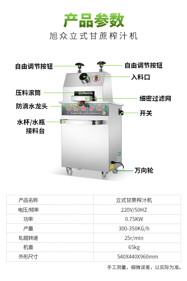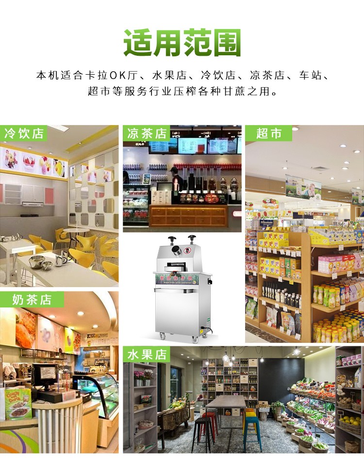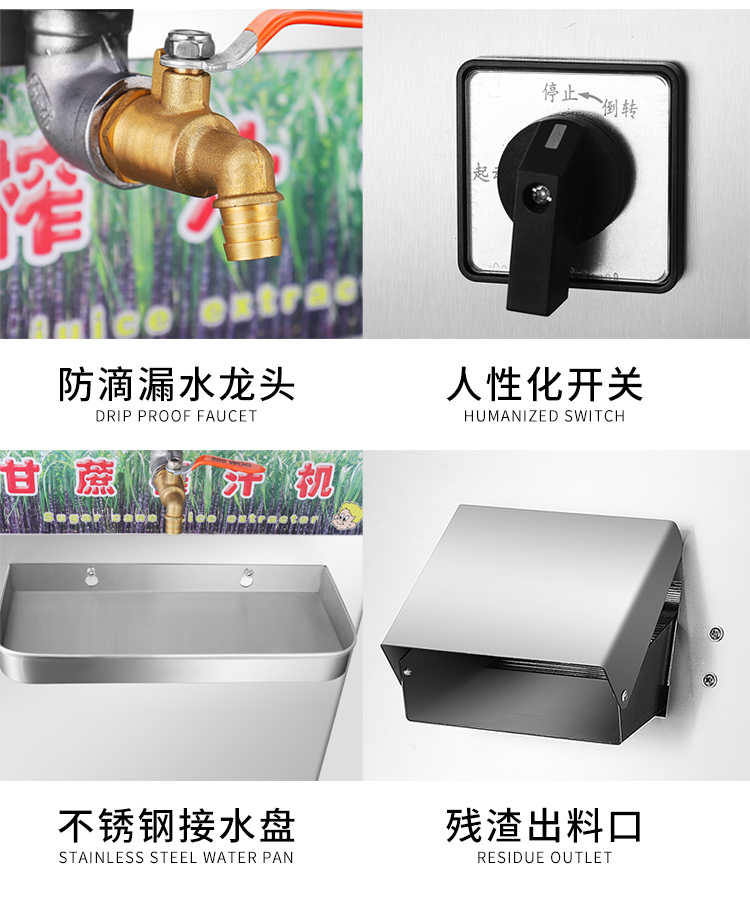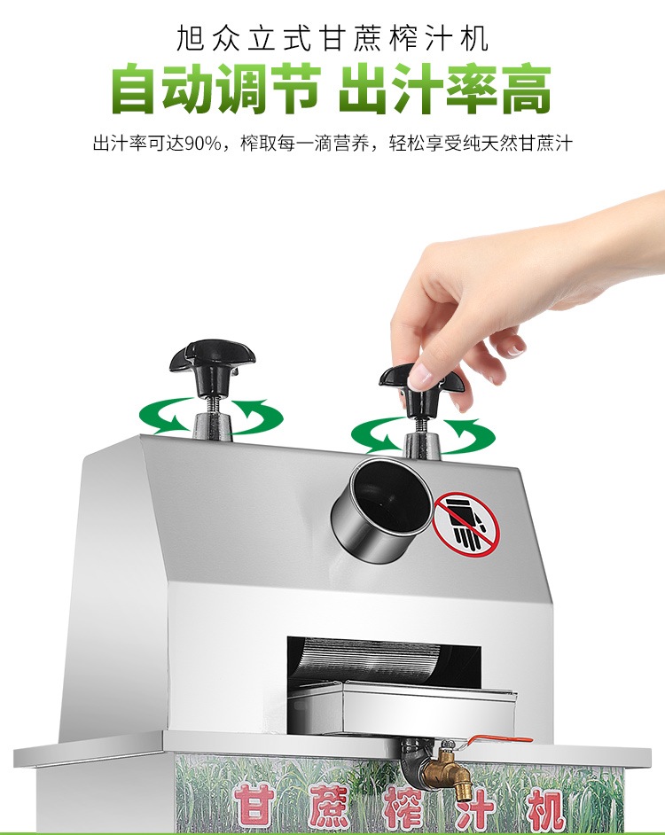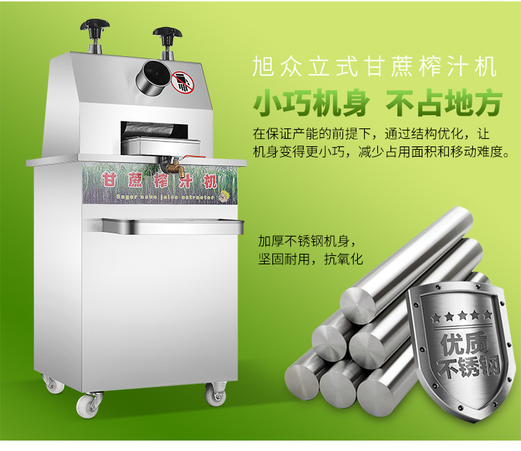 立式甘蔗機(jī),該機(jī)采用不銹鋼材質(zhì)加工,機(jī)頭部件都經(jīng)過嚴(yán)格的防銹仿腐蝕處理,整機(jī)采用全封閉結(jié)構(gòu),可內(nèi)置蔗渣桶,保證渣汁不外泄,安全、干凈、衛(wèi)生。 適合賓館、卡拉OK廳、水果店、冷飲店、涼茶店、車站、超市等服務(wù)行業(yè)壓榨各種甘蔗之用。