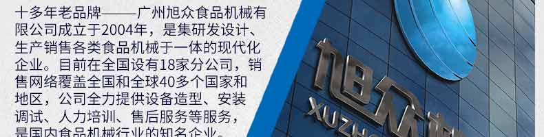 廣州旭眾食品機械有限公司是一家集科研開發(fā),生產設計,營銷服務為一體的現(xiàn)代化生產企業(yè)?,F(xiàn)代化生產車間,精湛制造技術,所產機械歷經市場重重考驗,不斷贏得海內外客戶的贊譽。