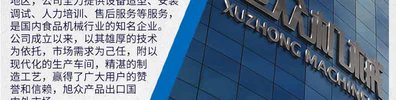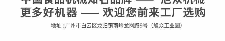 廣州旭眾食品機(jī)械有限公司是一家集科研開發(fā),生產(chǎn)設(shè)計(jì),營銷服務(wù)為一體的現(xiàn)代化生產(chǎn)企業(yè)?,F(xiàn)代化生產(chǎn)車間,精湛制造技術(shù),所產(chǎn)機(jī)械歷經(jīng)市場(chǎng)重重考驗(yàn),不斷贏得海內(nèi)外客戶的贊譽(yù)。