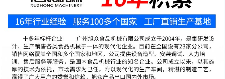 廣州旭眾食品機(jī)械有限公司是一家集科研開發(fā),生產(chǎn)設(shè)計(jì),營銷服務(wù)為一體的現(xiàn)代化生產(chǎn)企業(yè)?,F(xiàn)代化生產(chǎn)車間,精湛制造技術(shù),所產(chǎn)機(jī)械歷經(jīng)市場(chǎng)重重考驗(yàn),不斷贏得海內(nèi)外客戶的贊譽(yù)。
