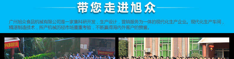 廣州旭眾食品機(jī)械有限公司是一家集科研開發(fā),生產(chǎn)設(shè)計,營銷服務(wù)為一體的現(xiàn)代化生產(chǎn)企業(yè)?,F(xiàn)代化生產(chǎn)車間,精湛制造技術(shù),所產(chǎn)機(jī)械歷經(jīng)市場重重考驗(yàn),不斷贏得海內(nèi)外客戶的贊譽(yù)。