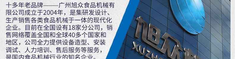 廣州旭眾食品機械有限公司是一家集科研開發(fā),生產(chǎn)設計,營銷服務為一體的現(xiàn)代化生產(chǎn)企業(yè)?,F(xiàn)代化生產(chǎn)車間,精湛制造技術,所產(chǎn)機械歷經(jīng)市場重重考驗,不斷贏得海內(nèi)外客戶的贊譽。