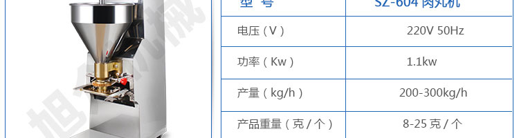 SZ-604肉丸成型機(jī),肉丸成型機(jī)采用不銹鋼材質(zhì),丸子直徑可達(dá)15-35mm,可以制作各類爽脆,有韌性、有彈性的豬肉丸、魚(yú)丸、牛肉丸、貢丸、雞肉丸等