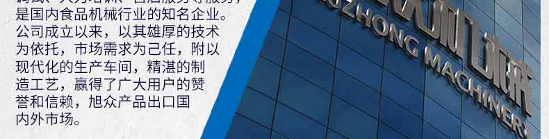 廣州旭眾食品機(jī)械有限公司是一家集科研開發(fā),生產(chǎn)設(shè)計(jì),營銷服務(wù)為一體的現(xiàn)代化生產(chǎn)企業(yè)?,F(xiàn)代化生產(chǎn)車間,精湛制造技術(shù),所產(chǎn)機(jī)械歷經(jīng)市場重重考驗(yàn),不斷贏得海內(nèi)外客戶的贊譽(yù)。