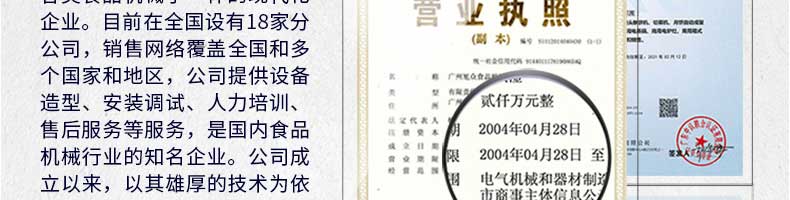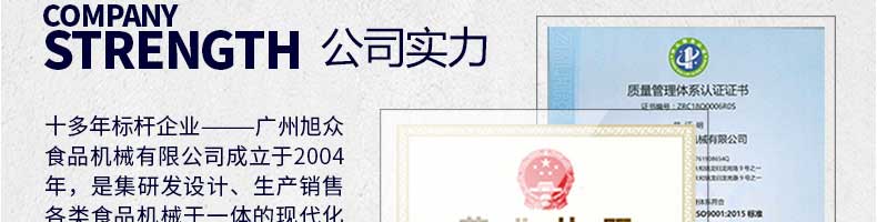廣州旭眾食品機(jī)械有限公司是一家集科研開發(fā),生產(chǎn)設(shè)計(jì),營(yíng)銷服務(wù)為一體的現(xiàn)代化生產(chǎn)企業(yè)?,F(xiàn)代化生產(chǎn)車間,精湛制造技術(shù),所產(chǎn)機(jī)械歷經(jīng)市場(chǎng)重重考驗(yàn),不斷贏得海內(nèi)外客戶的贊譽(yù)。