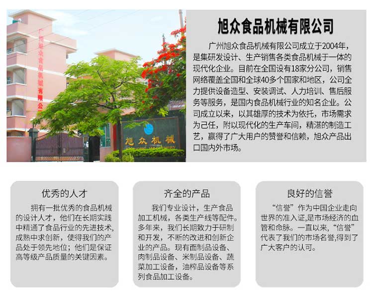 廣州旭眾食品機(jī)械有限公司是一家集科研開發(fā),生產(chǎn)設(shè)計(jì),營銷服務(wù)為一體的現(xiàn)代化生產(chǎn)企業(yè)?,F(xiàn)代化生產(chǎn)車間,精湛制造技術(shù),所產(chǎn)機(jī)械歷經(jīng)市場重重考驗(yàn),不斷贏得海內(nèi)外客戶的贊譽(yù)。
