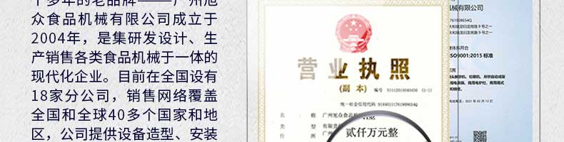 廣州旭眾食品機(jī)械有限公司是一家集科研開發(fā),生產(chǎn)設(shè)計(jì),營銷服務(wù)為一體的現(xiàn)代化生產(chǎn)企業(yè)?,F(xiàn)代化生產(chǎn)車間,精湛制造技術(shù),所產(chǎn)機(jī)械歷經(jīng)市場(chǎng)重重考驗(yàn),不斷贏得海內(nèi)外客戶的贊譽(yù)。