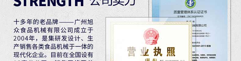 廣州旭眾食品機(jī)械有限公司是一家集科研開(kāi)發(fā),生產(chǎn)設(shè)計(jì),營(yíng)銷(xiāo)服務(wù)為一體的現(xiàn)代化生產(chǎn)企業(yè)?,F(xiàn)代化生產(chǎn)車(chē)間,精湛制造技術(shù),所產(chǎn)機(jī)械歷經(jīng)市場(chǎng)重重考驗(yàn),不斷贏得海內(nèi)外客戶的贊譽(yù)。